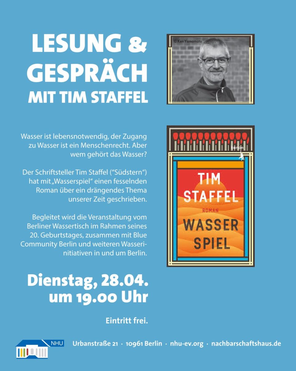 Begleitet wird die Veranstaltung – thematisch passend – vom Berliner Wassertisch im Rahmen seines 20. Geburtstages, zusammen mit Blue Community Berlin und weiteren Initiativen in und um Berlin, die sich seit vielen Jahren u.a. für den Schutz von Wasser als öffentlichem Gut engagieren.