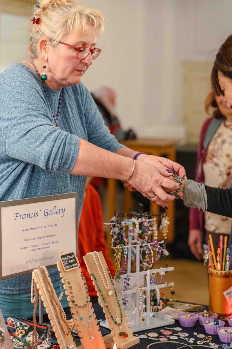 Am Nachmittag des 5. Dezember kamen viele Besucher*innen zu unserem Winterbasar – Handgemacht & Herzenswarm im Nachbarschaftshaus Urbanstraße. Sie lauschten Liedern und Musik, genossen Kuchen, Gebäck und Waffeln, wärmten sich mit Punsch und Suppe oder im Garten an der Feuerschale, kauften schöne Dinge an den vielfältigen Basar-Ständen, bastelten Weihnachtsschmuck oder Meisenringe.